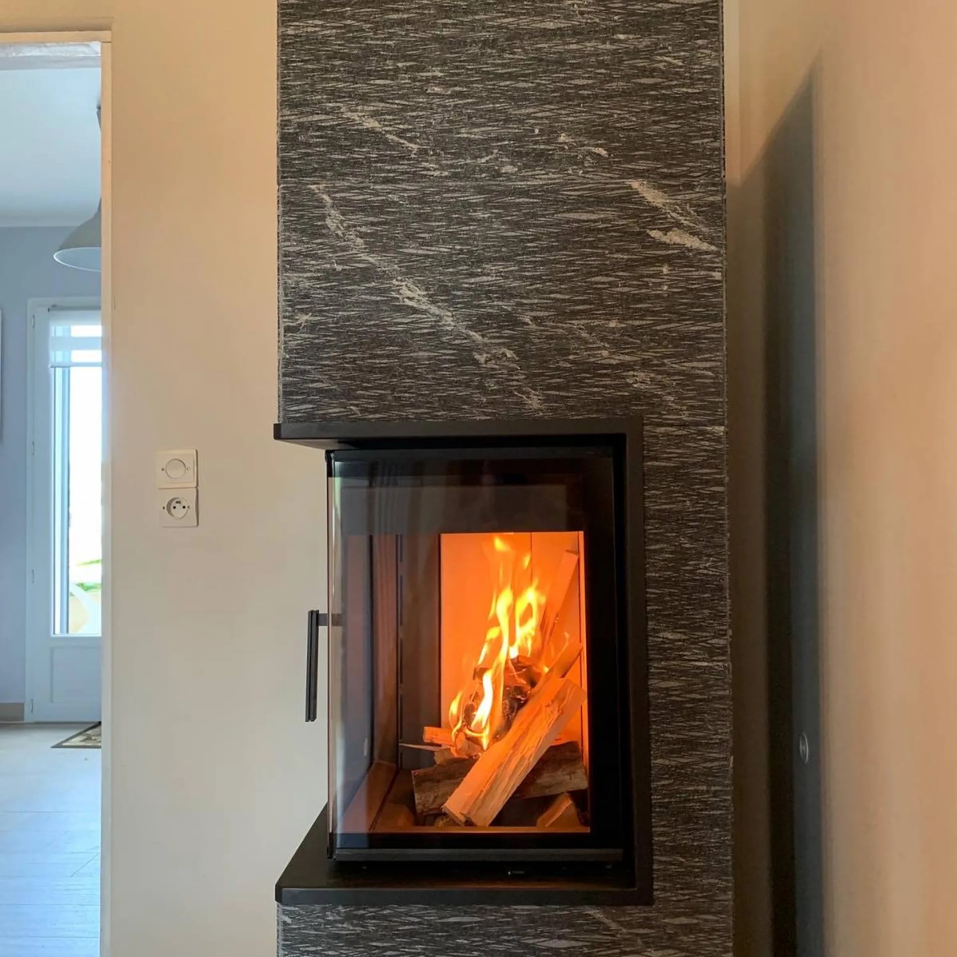 Redécouvrez la pierre ollaire et sa nouvelle texture grafia, sur un poêle de semi-masse d'angle avec une vision du feu sur deux cotés. Une nouvelle expérience du feu dans un poêle à bois et sa pierre stéatite, le minéral dans votre maison de Bouliac en fera un élément de décoration à part entière et l'originalité de la nouvelle texture, vous démarquera des standard de décoration intérieure.