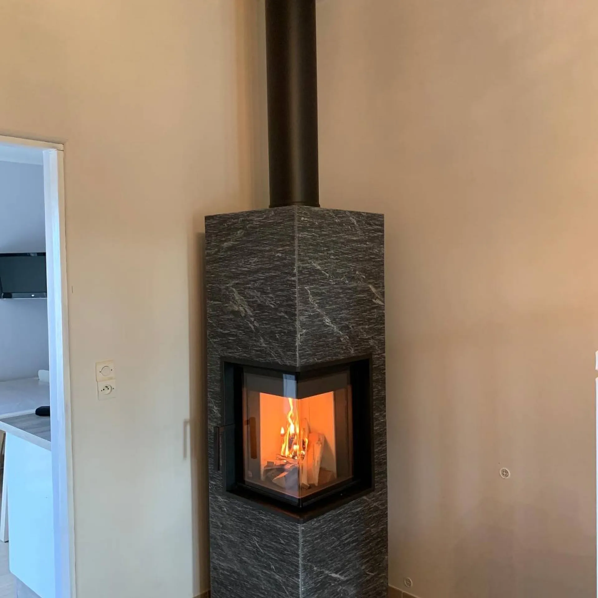 Pose d'un poêle en pierre ollaire de semi-masse en angle de petite taille en Gironde à Bouliac